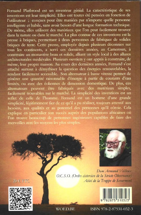 Fernand Platbrood est un inventeur génial. La caractéristique de ses inventions est leur simplicité. Elles ont toutes été pensées en fonction de l’utilisateur ; conçues pour être maniées par n’importe quelle personne intelligente et habile, sans avoir besoin d’une longue formation technique. De même, elles utilisent des matériaux que l’on peut facilement trouver dans la nature ou dans le marché. La plus connue de ces inventions est la presse à briques, permettant à deux personnes de fabriquer de solides briques de terre. Cette presse, employée depuis plusieurs décennies sur tous les continents, a servi ces dernières années, au Cameroun, à construire un monastère beau et solide, alliant un style local à des allures architecturales médiévales. Plusieurs ouvriers y ont appris à construire, de même, leur propre maison. Au cours des dernières années, Fernand s’est attaché surtout à démythiser la question des énergies renouvelables, la rendant facile et accessible. Son alternateur à basse vitesse permet de générer une quantité raisonnable d’énergie à partir de courants d’eau limités, ou avec des éoliennes de dimension domestique. De plus, ces alternateurs peuvent être fabriqués avec des matériaux simples, facilement trouvables sur le marché. La simplicité des inventions est un reflet de celle de l’homme. Fernand est un homme d’une grande simplicité, légitimement fier de ce qu’il a pu réaliser, toujours attentif aux besoins, aux qualités et au potentiel des personnes qu’il côtoie. Cela explique en particulier son succès auprès des populations africaines où l’on trouve beaucoup de personnes ingénieuses capables de faire des merveilles avec les moyens les plus simples.